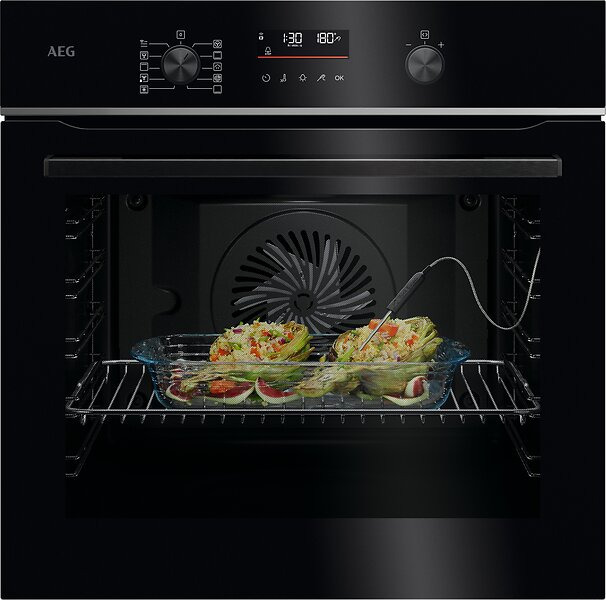 ДУХОВОЙ ШКАФ AEG V5PBA521AB выполнен в глубоком чёрном оттенке, который гармонично смотрится как в контрастных, так и в монохромных интерьерах, подчёркивая лаконичную фронтальную панель и аккуратную ручку. Плоская поверхность фасада, утопляемые переключатели и LED-дисплей формируют минималистичный облик, который не перегружает пространство и легко вписывается в модульную мебель. Визуальная простота скрывает высокотехнологичное наполнение: полный набор режимов позволяет реализовать разные кулинарные замыслы от бережного приготовления на пару до интенсивного гриля. Объём внутренней камеры 71 литр и пять уровней расположения аксессуаров обеспечивают гибкость размещения противней и решёток, что удобно при приготовлении больших блюд или одновременном запекании нескольких лотков. Хромированные направляющие гарантируют плавное перемещение секций и выдерживают нагрузку значительных форм, а комплект из одного глубокого противня, одного противня для выпечки и одной хромированной решётки покрывает базовые требования к сервировке. Плавное закрытие дверцы уменьшает шум при эксплуатации и бережёт механизм, а вентилятор охлаждения продлевает срок службы элементов за счёт поддержания оптимальной температуры в панели управления. Набор способов нагрева включает горячий воздух, конвекцию с кольцевым нагревательным элементом, режим «пицца», верхний и нижний нагрев, нижний нагрев с грилем и конвекцией, гриль и гриль с конвекцией, режим для замороженных продуктов, а также режим быстрого разогрева; такое разнообразие покрывает широкий спектр рецептур и текстур. Паровая функция SteamBake поддерживает необходимую влажность при выпечке, что особенно важно для хлеба и сдобных изделий: корочка приобретает привлекательную хрусткость, а мякоть остаётся сочной. Термосенсор (термощуп) обеспечивает точный мониторинг внутренней температуры продуктов, позволяя получать стабильный результат без необходимости постоянной проверки. Управление реализовано электронно с комбинированной системой сенсорных зон и поворотных, утапливаемых переключателей — это даёт интуитивную настройку и аккуратный внешний вид панели. Присутствие LED-дисплея и функционального таймера с режимами звукового сигнала, обратного отсчёта, установки продолжительности приготовления и отсрочки старта делает процесс планирования проще: можно задать кодировку времени и забыть о блюде до окончания цикла. Автоматическое отключение повышает безопасность, а блокировка от детей предотвращает случайные включения и изменённые настройки. Очистка камеры проводится пиролитическим способом: высокая температура превращает остатки пищи в пепел, который затем просто удаляется влажной тканью, что исключает применение агрессивных моющих средств. При этом режимы паровой обработки и возможность комбинирования с традиционными нагревателями расширяют спектр приготовления без компромиссов по удобству ухода. Освещение внутри камеры с одной галогенной лампой сверху даёт ровный свет и удобство наблюдения за ходом процесса без открытия дверцы. Девять режимов и автоматические рецепты помогают новичку и экономят время опытного пользователя, а режимы для замороженных продуктов и функция «быстрый нагрев» ускоряют старт готовки без потери качества. В итоге устройство предлагает прем