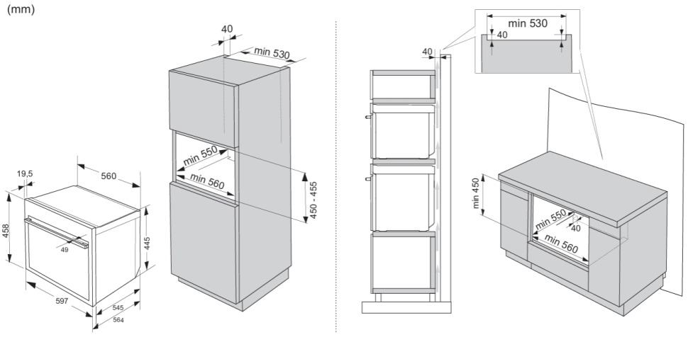 Размеры ниши для встраивания (В × Ш × Г): 45–45,5 × 56 × 55 см.