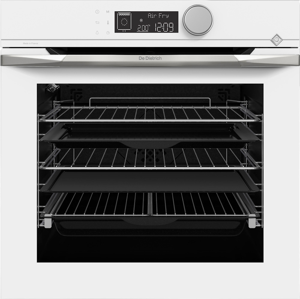 Духовой шкаф De Dietrich DOP4556W (коллекция Philharmonie) — электрический прибор белого цвета с ручкой из нержавеющей стали и электронным управлением (сенсорные клавиши и поворотные переключатели с белой светодиодной подсветкой). Оснащён LCD‑дисплеем 113×33 мм, отображающим все необходимые данные, и функцией предварительного выбора температуры. Объём камеры — 73 л; внутреннее освещение — галогенное.