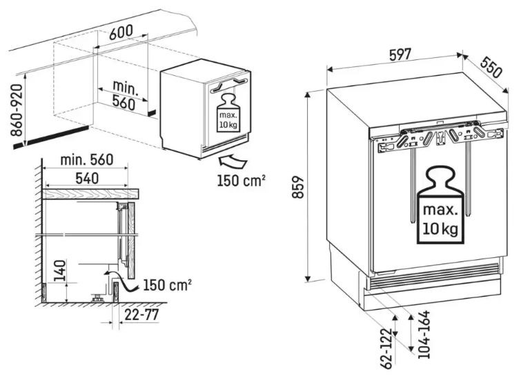 Объем ниши (ВхШхГ): 860-920х600х560 мм.