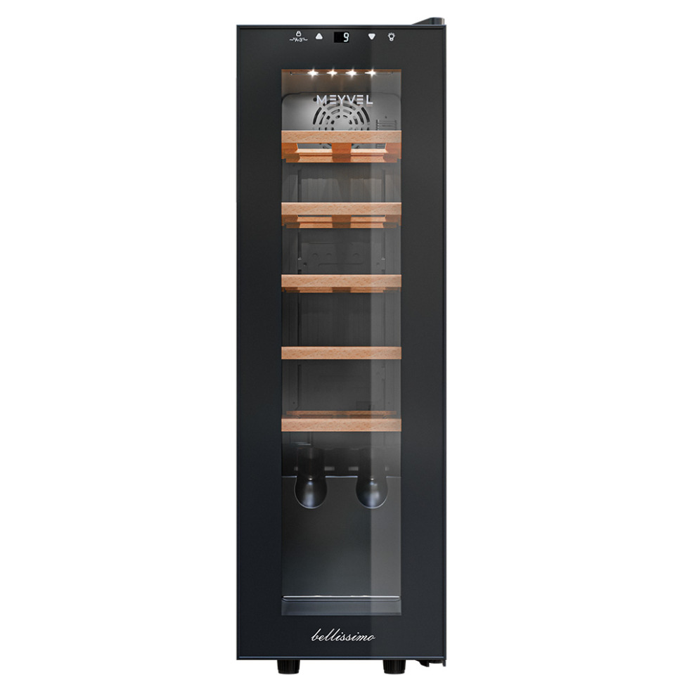 Винный шкаф Meyvel MV12‑CBF1 — монотемпературный, рассчитанна 12 бутылок вина. Поддерживает температуру +5…+18 °C,влажность 60–80 %. Оснащён компрессорным охлаждением, LED‑подсветкой.Двойное стекло с УФ‑фильтром защищает вино от солнечных лучей.Сенсорное управление, регулируемые ножки, чёрный металлический корпус.