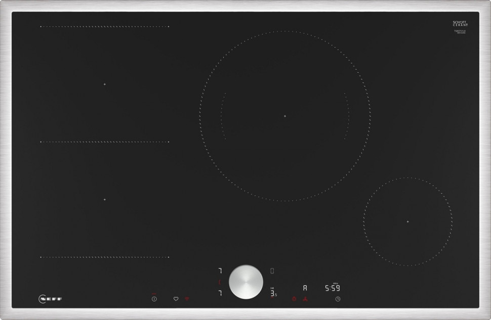 Индукционная варочная панель NEFF T58STS1L0 представляет собой современное решение для кухни премиум-класса с элегантным дизайном в черном цвете и обрамлением из нержавеющей стали.